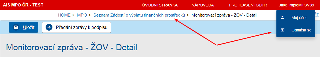 • po dokončení práce na rozpracované monitorovací zprávě a uložení provedených změn, lze detail opustit odhlášením, zvolením jiné položky v levém menu nebo odkazem v tzv. drobečkové navigaci. O úroveň výše např. z detailu zprávy na harmonogram zpráv, se lze dostat také odkazem ZPĚT umístěným pod jménem přihlášeného uživatele. Na centrální harmonogram (stránka Dashboardu) se lze dostat přes odkaz HOME nebo MPO v drobečkové navigaci či kliknutím na logo AIS MPO nad levým menu aplikace.