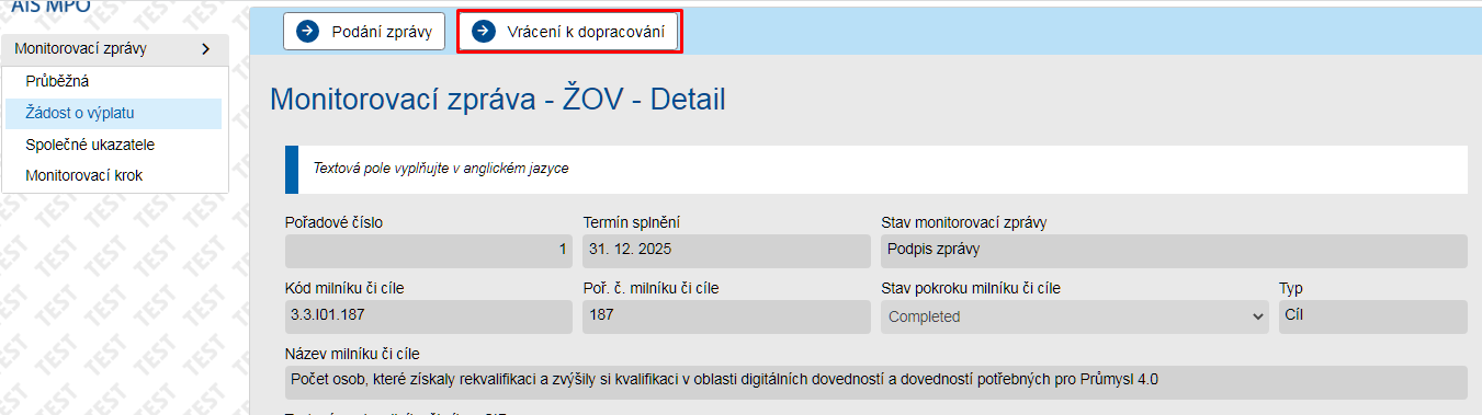 Menu: Monitorovací zprávy -> Žádost o výplatu Postup: • v detailu ŽoV ve stavu Podpis zprávy se provede tlačítkem Vrácení k dopracování vrácení ŽoV vlastníkovi komponenty do stavu Příprava zprávy. Pro přechod stavu se nevyžaduje ani neumožňuje zadání důvodu vrácení;